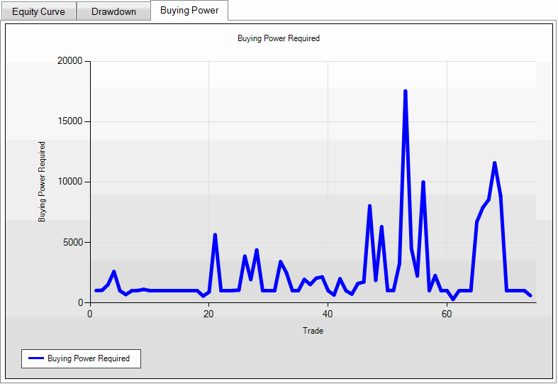 The buying power graph shows the minimum buying power required throughout the simulation period. Strategies that hold many simultaneous positions will require more buying power. This graph can help you determine how much money you'd need to allocate to trade every signal that appears.