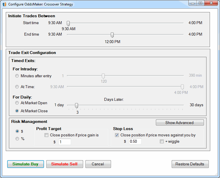 | Dollars/Shares | this field determines position sizing. When dollars is chosen, the value for the field is the amount of dollars to allocate for the position. When shares is chosen, a constant amount of shares is allocated for the position. |