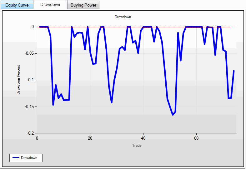 The drawdown graph shows the drawdowns over the simulation period. A drawdown is the peak to trough decline of the equity curve. Large drawdowns are what make traders quit trading. While there is no way to completely eliminate drawdowns, you should understand what drawdowns are likely for a given system and size positions accordingly.
