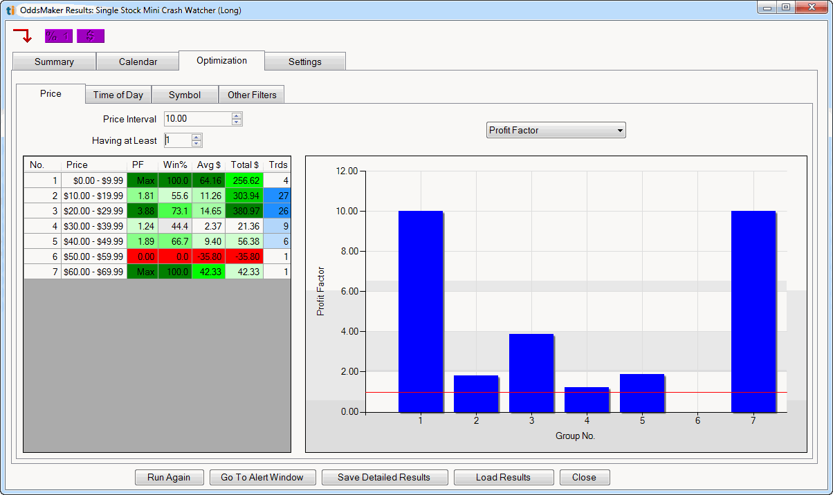 The optimization tab allows you to drill down into the details of the strategy to see what makes it work. Each tab contains a reporting engine that can breakdown your strategy by different filters allowing you to see which subsets of the trades work well and which don't. You can use the information here to add additional filters to your strategy to improve it.