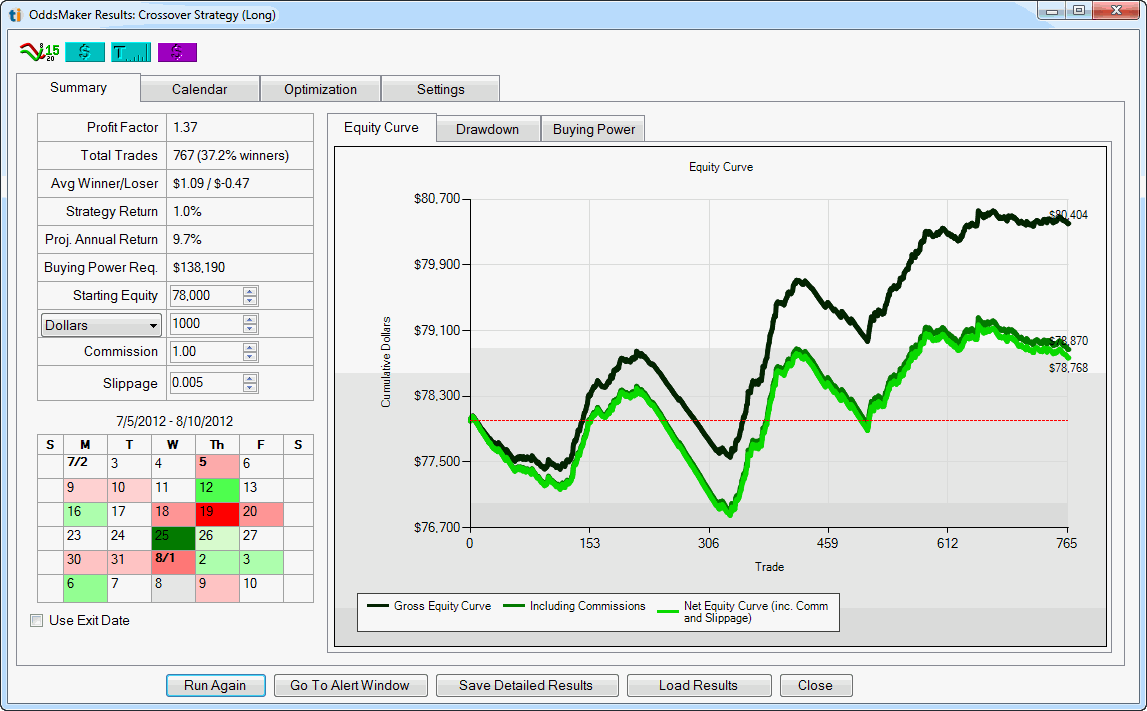 The equity curve shows the change in your total equity over the simulation period. Most trades are looking for a smooth, upward sloping equity curve. Often times just glancing at the equity curve can identify problem areas that might not be obvious by looking only at the metrics. The curves also make it easy to see the effect that commissions and slippage have on the strategy.