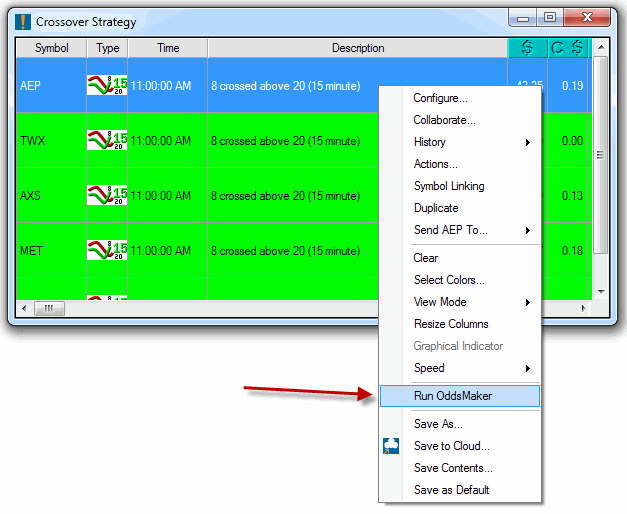 The OddsMaker is located on the right-click menu in an alert window. Choose the Run OddsMaker menu item to bring up the OddsMaker.