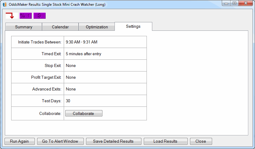 Click Simulate Buy or Simulate Sell to run the OddsMaker. As it's running the following window will appear and show progress. The green portion of the progress bar indicates how many trades so far have been winners and the red portion shows how many trades have been losers so far. The alerts and filters used in the strategy that is being tested appears in the form of icons in the top left part of the window.