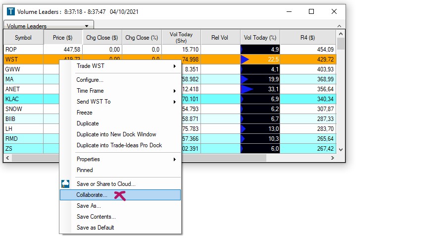 The Collaborate Feature enables you to export your strategies to your phone. Just right-click into your Alert, Top List, or Multi-Strategy Window and select Collaborate.