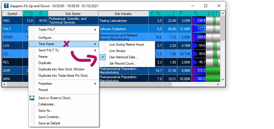 The Time Frame function enables you to define when your Top List Window will be active. You can choose between Live During Market Hours, which means from 9.30 am to 4.30 pm Eastern Time, or Live Always, which then includes Pre- and Post-Market.