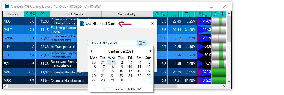 In addition to that, you can go back in time around 60 days by selecting Use Historical Date and then choosing a Date and Time. Press the OK button and you will see the Window will fill with historical data. The caption of the Top List Window will be updated to show the historical date and time period on display. The Top List Window will show a 5-minute time frame.