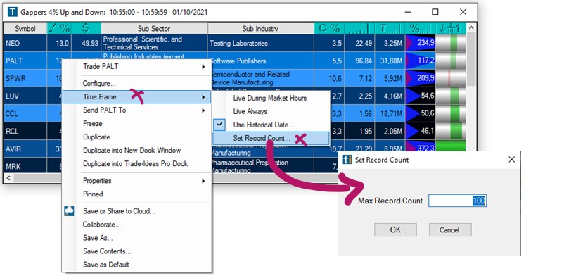By default, a Top List will return the 100 top results. You can increase the Record Count to show up to 1000 results at once. To do so, right-click into the Top List Window, select Time Frame, and then Set Record Count.