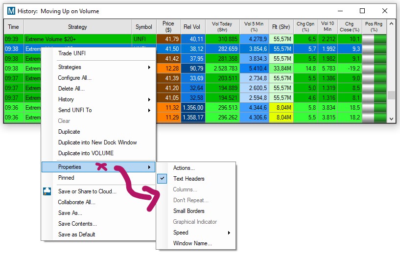 Each Multi-Strategy Window has a Properties Menu that enables you to modify the visual appearance of the window itself as well as the data within it.