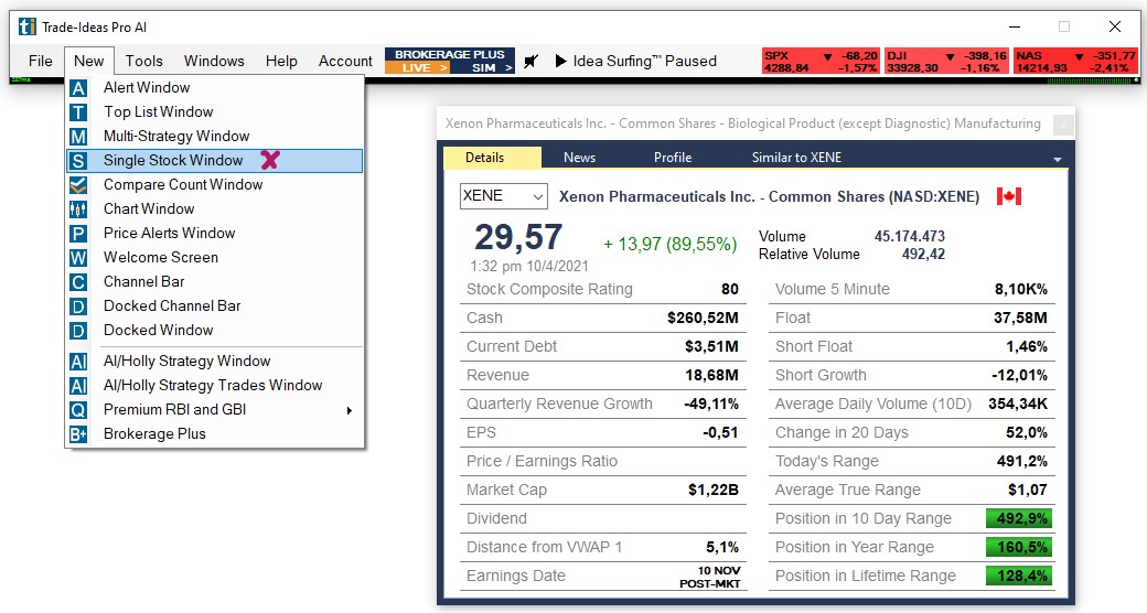 The Trade Ideas Single Stock Windows provides key fundamental and other customizable data about a chosen stock. With Symbol Linking enabled by default, it will automatically display details about the symbol that you selected in your scanner or chart.