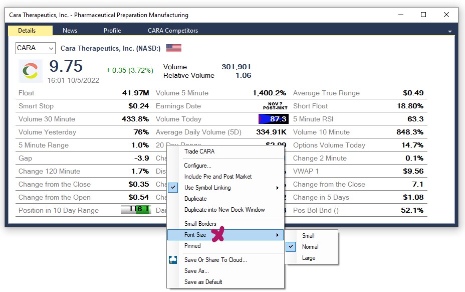 You can change the Font Size of the Single Stock Window from the default size normal to small or large by right-clicking into the window, selecting Font Size and making your selection: