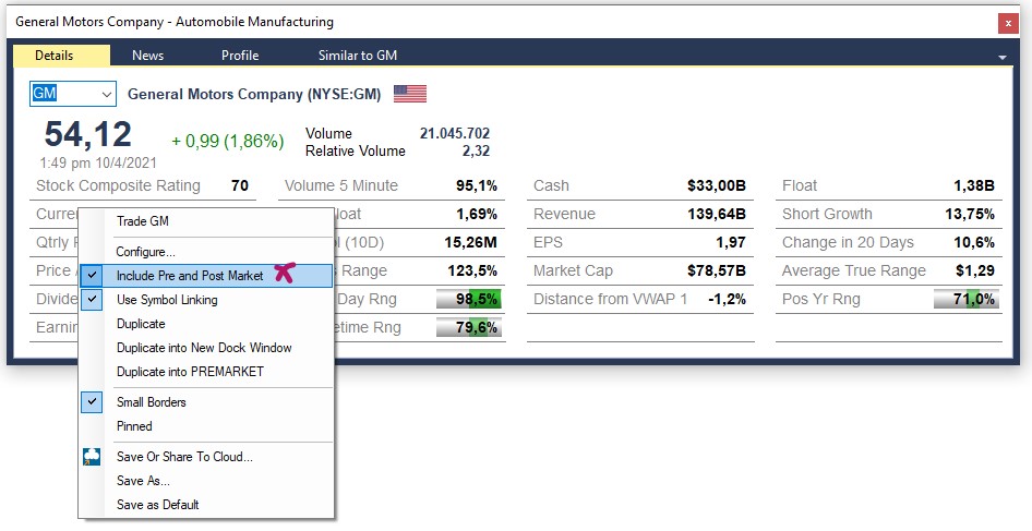 If you would like your Single Stock Window to display Pre and Post Market data for stocks, right-click and select Include Pre and Post Market.