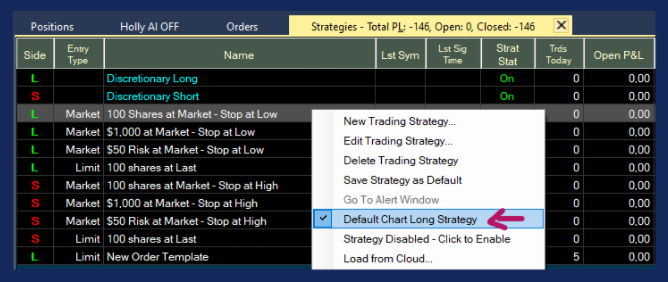 Right-click and check Default Chart Long Strategy or Default Chart Short Strategy.