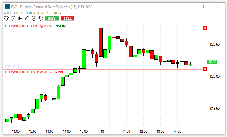 Once your order is filled, the blue line will disappear and the projected Loss and Profit in Dollars will be displayed at the Target and Stop Loss line.