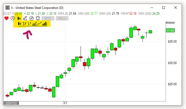 To quickly change the style of your chart, use the Chart Style Icon found on the top left-hand side of the Chart Window.