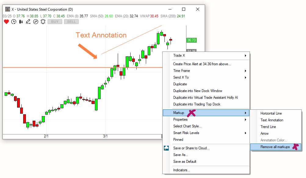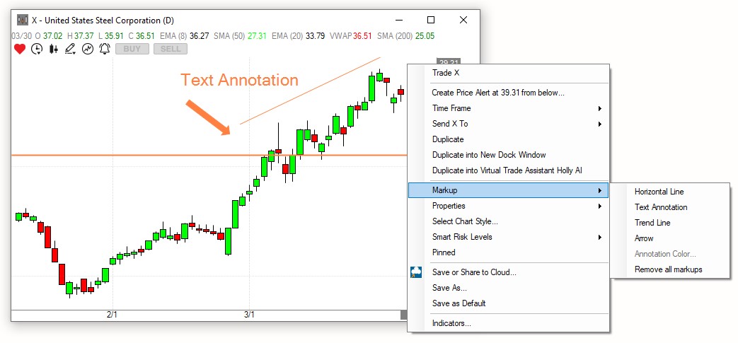 To mark up the Chart with Lines, Trendlines, Arrows, or Text Annotations, right-click into the Chart and select Markup.