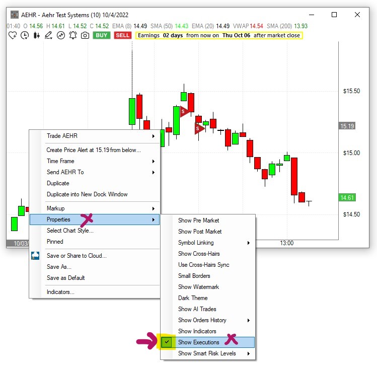 To enable/disable the execution flags, right-click into the chart, select Properties and check/uncheck the option Show Executions.