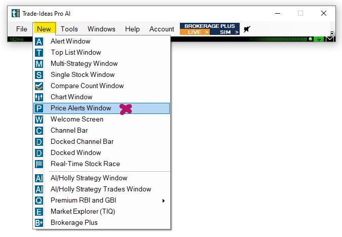 To create a new Price Alert, go to the Toolbar, select New, and then, Price Alerts Window.