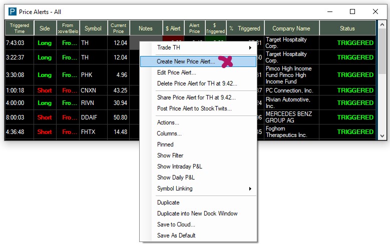Now, right-click into your Price Alerts Window and select, Create New Price Alert.