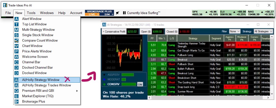 The Premium AI Strategy Window will list the strategies that Holly, after a long night of backtesting and optimization, has carefully selected for the upcoming trading day.