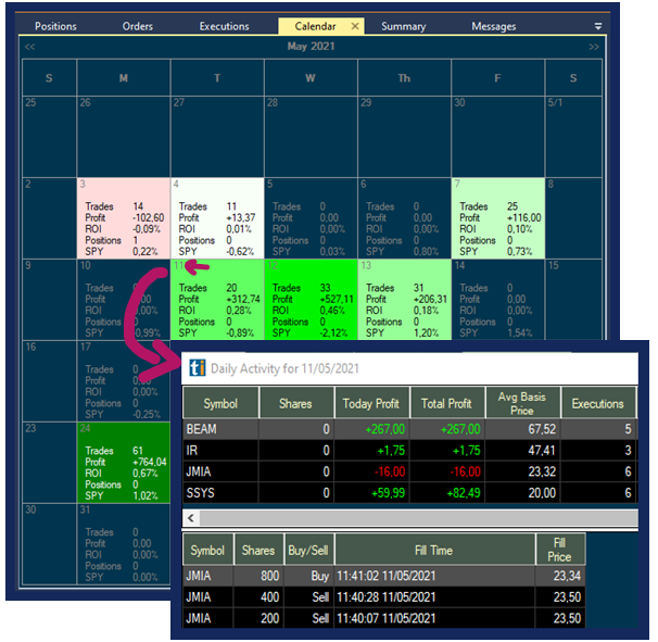 The Calendar Tab displays details about the daily trades and their parameters. Double-click on the calendar day in the top left-hand corner to open a new window that shows the executed trades in detail.