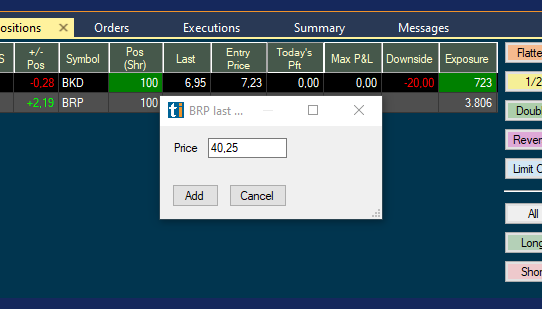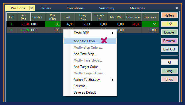 To add a Stop Loss to your trade, highlight your position, then right-click and select Add Stop Order. Thereafter, choose a value for your Stop Loss. The newly added Stop Loss will be displayed in a column in the Positions Tab as well as on the chart of the stock as a line including the projected loss value.