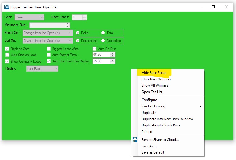 To go back to the racing view, right-click again and select Hide Race Setup.