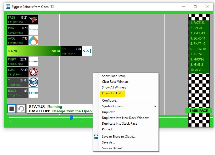To open the underlying Top List Window, right-click into the race window and select Open Top List: