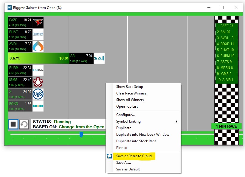 If you would like to retain your Race Configuration, save it to your cloud. To do so, right-click into the Race Window and select Save or Share to Cloud:
