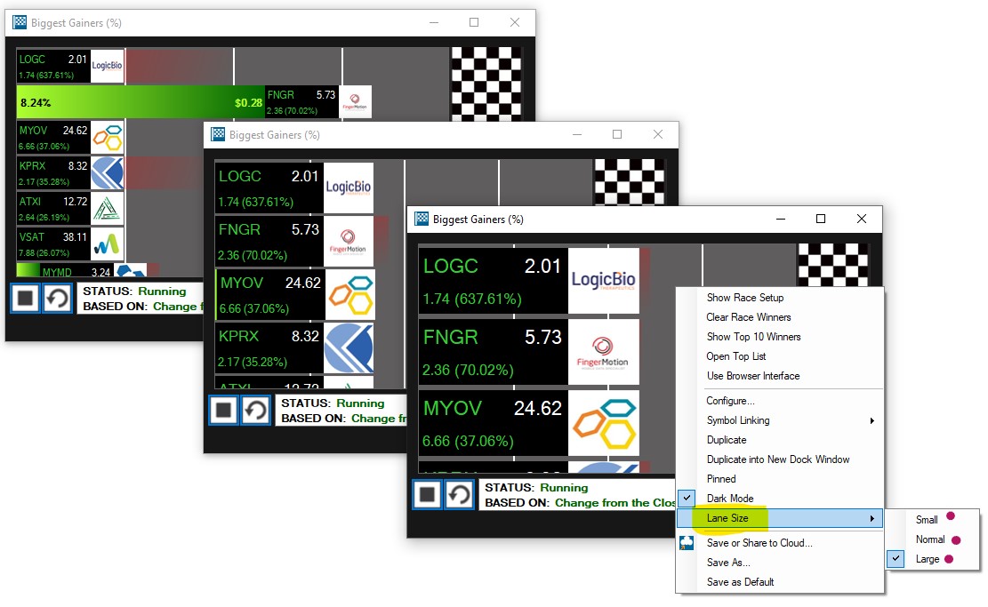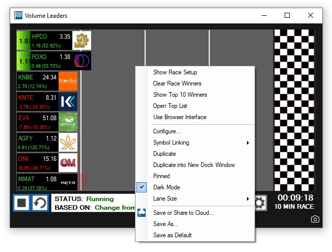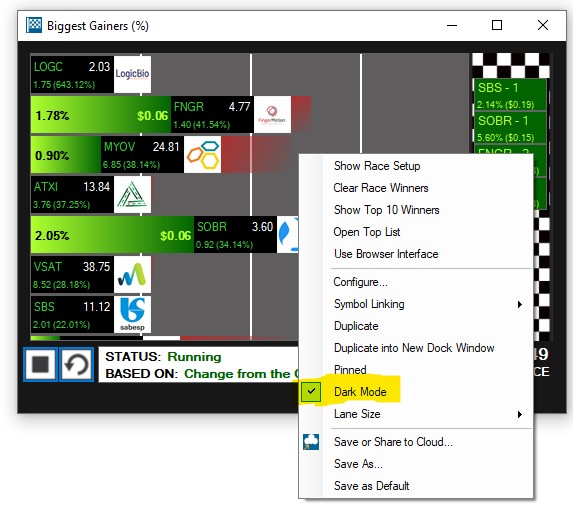 To switch to Dark Mode, right-click into the race window and check the option Dark Mode.