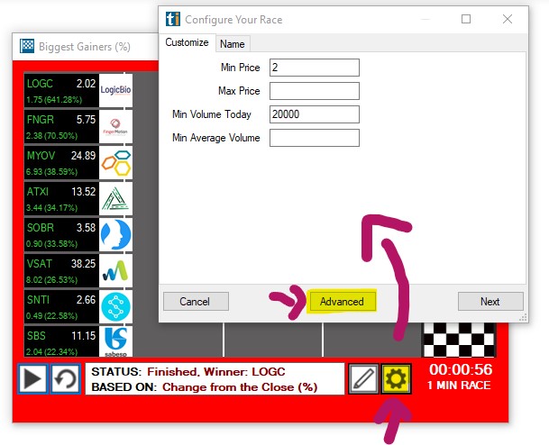 Here, you can change the minimum and maximum price of stocks, as well as Today's Volume and the Average Volume (over the last 10 days) of all stocks that will appear in your race.