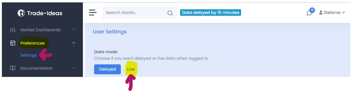 To switch from delayed to live data mode, select Preferences, and then Settings in the Sidebar. Under User Settings, select Live as the data mode.