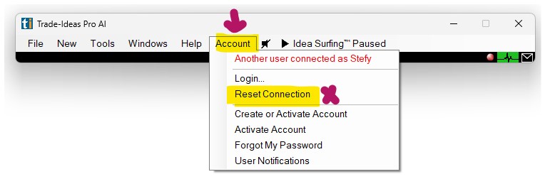 Please note: Enabling live data in the Market Dashboards will log you out of any other TI Pro session. To switch back to another instance of TI Pro, simply reset your connection on the device you would like to use next: