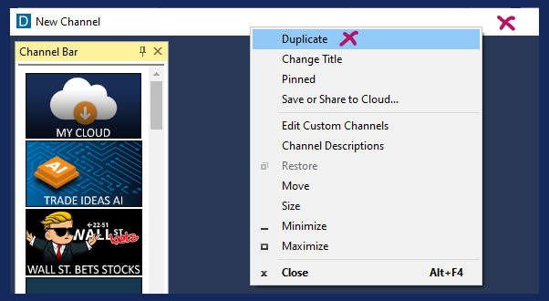 To duplicate a Docked Channel Bar or Docked Window, right-click into its header and select Duplicate. You will now have an exact copy of your Docked Channel Bar.