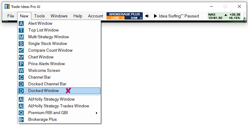 To open a blank Dock, go to the Toolbar, open the New Tab and select Docked Window. Give your new Dock a Name and press OK.