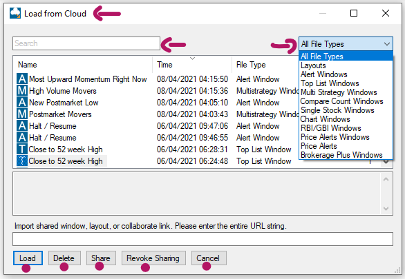 Once you have selected an item, you have the choice of loading, deleting, or sharing it. In addition to that, you can revoke the sharing of any previously shared layouts or strategies.