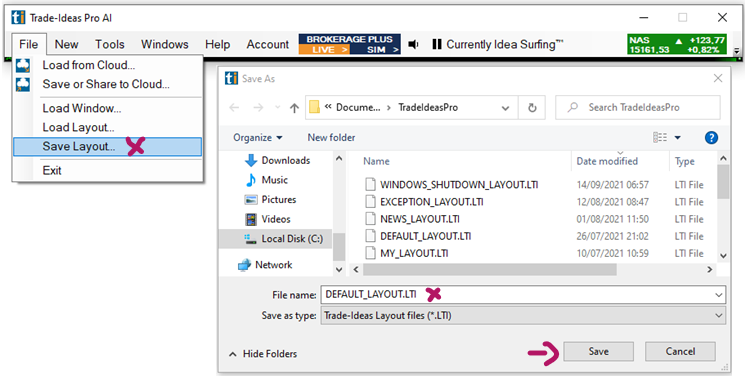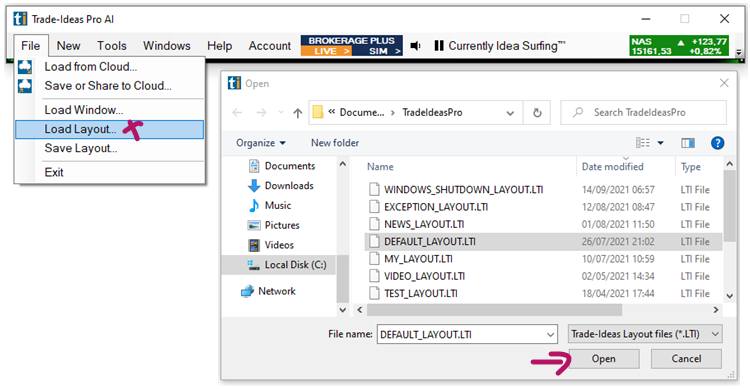 To access any saved layout, open the File Tab of the Toolbar and select Load Layout. This will open the TradeIdeasPro folder on your local computer where these layouts are saved.