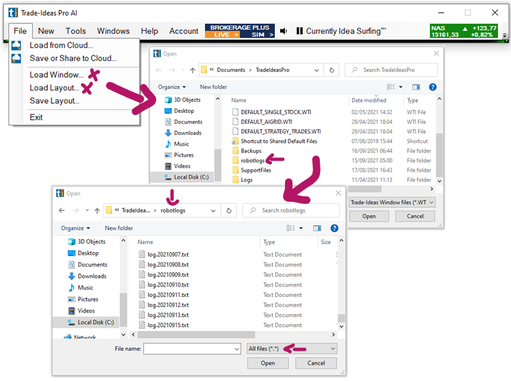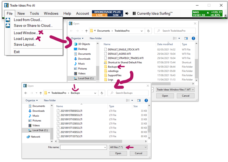 The software automatically creates backup files of your default layout in regular intervals while the program is running. These backup files with the extension .LTI are stored on your local computer in the TradeIdeasPro Backups folder. The Backups folder can be accessed via the Load Layout and Load Window option. Select Backups from the list of available files and folders. To see the individual .LTI files, select All Files from the dropdown in the bottom right-hand corner of the popup menu. You will find multiple backup files of your default layout covering several days.