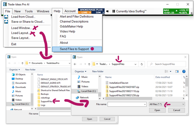 If you contact our support team for troubleshooting purposes, you might be asked to send your log files via the Send Files to Support option in the Help Tab of the Toolbar (Toolbar > File > Load Window/Load Layout > SupportFiles).