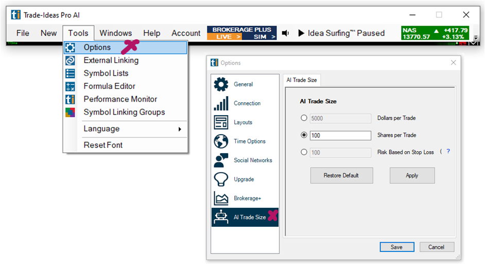 By Default, the Risk Size for all Holly AI trades and calculations is set to 100 shares per trade. This setting can be adjusted to reflect your personal investment style.