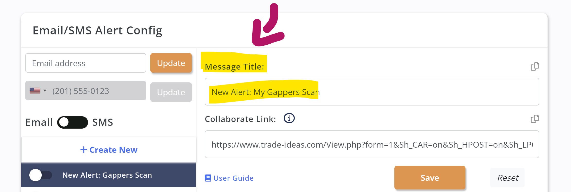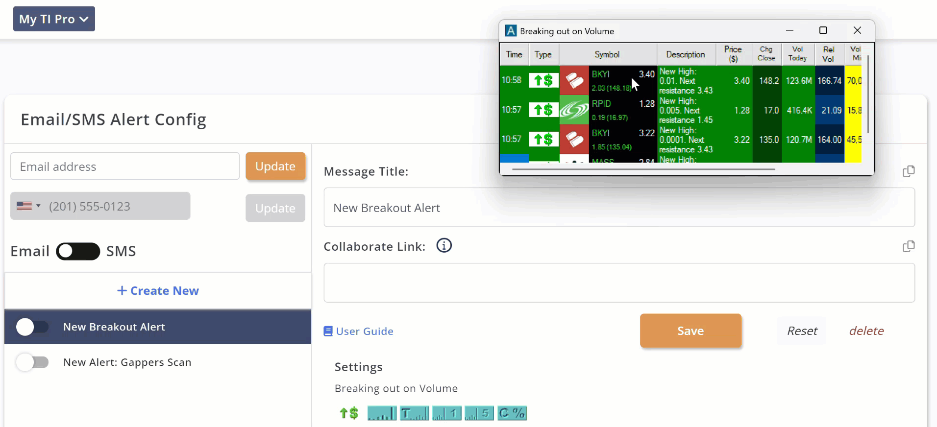 You can receive the alerts from your Alert Window as an email or SMS text notification. Top List Windows or other scan types do not support this functionality.