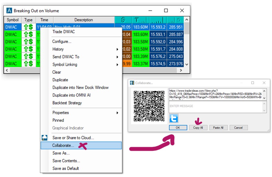 Next, right-click into your Alert Window scan, and select Collaborate. Choose Copy All, then paste this code into the Collaborate Link field.