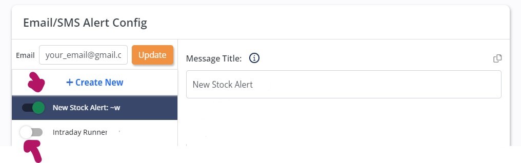 To enable/disable Email/SMS notifications for your strategy, move the slider next to your strategy from left to right or vice versa.