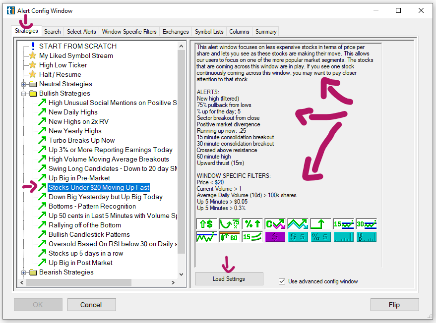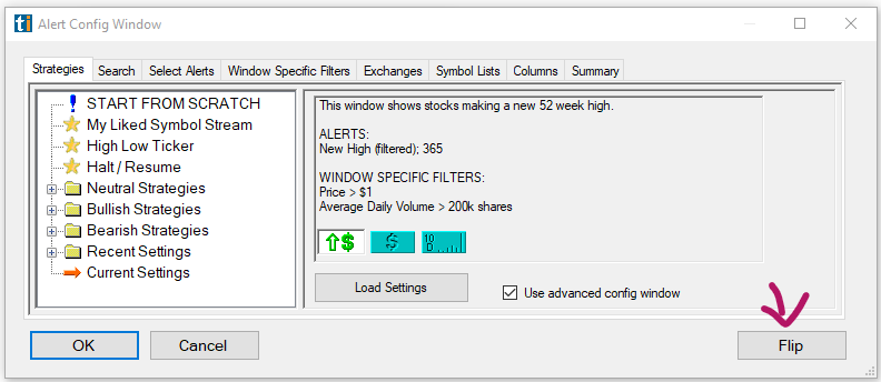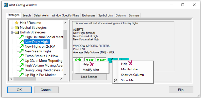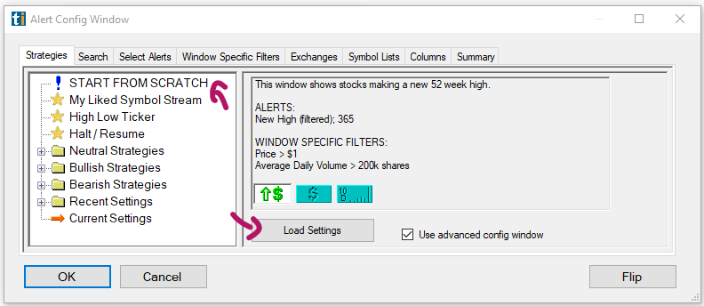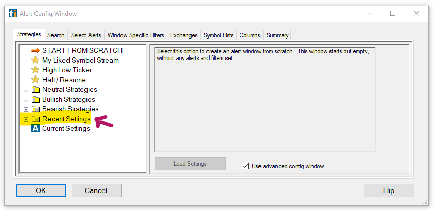The Strategies Tab inside the Alert Config Window provides access to many pre-configured strategies as well as your own recent strategies.