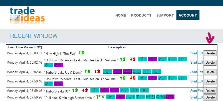 The following page will list all the strategies that are listed under Recent Settings in the Alert Configuration Window and enables you to view, edit or delete them: