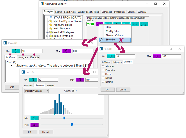 The Show Me option is a great tool when you are uncertain about the exact filter settings, or would like to see the effects filter changes will have on the number of stocks available to scan.