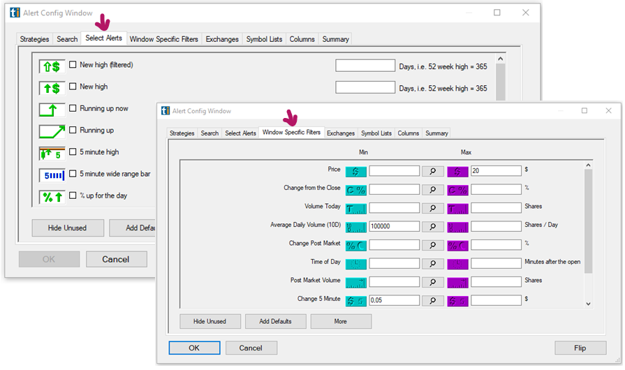A click on any Alert icon will open up the Select Alerts Tab, where you can check or un-check the alerts in use. A click on any Filter icon will open up the Windows Specific Filters Tab. where you can modify each filter.